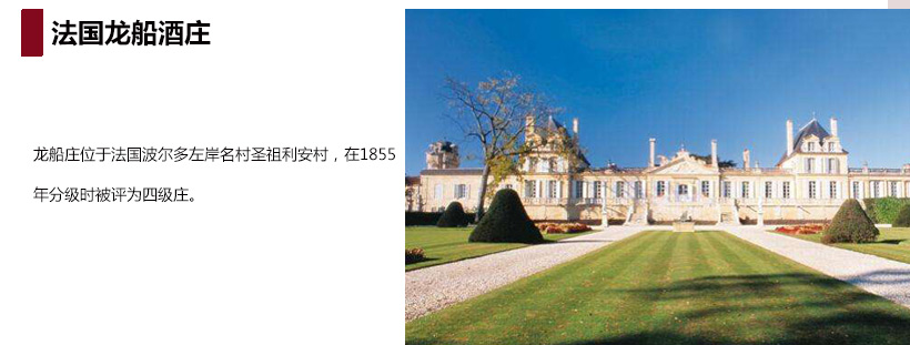 龙船庄园城堡仿凡尔赛宫而建,其后花园拥有“波尔多凡尔赛宫“之称。龙船庄酒庄面积年50公顷,葡萄种植面积为90公顷,葡萄园的葡萄品种:62%赤霞珠,31%美乐,5%品丽珠,2%小维度。龙船庄凭其吉祥的酒名、易认的酒标、卓越的酒质成为在中国知名度最高、最畅销的法国名酒庄之一。其副牌酒和附属品牌都与正牌酒出自同一酿酒团队之手,国际顶尖的酿酒技术,精选最优质的葡萄,严格的庄园管理,是中国葡萄酒市场最畅销的品牌。